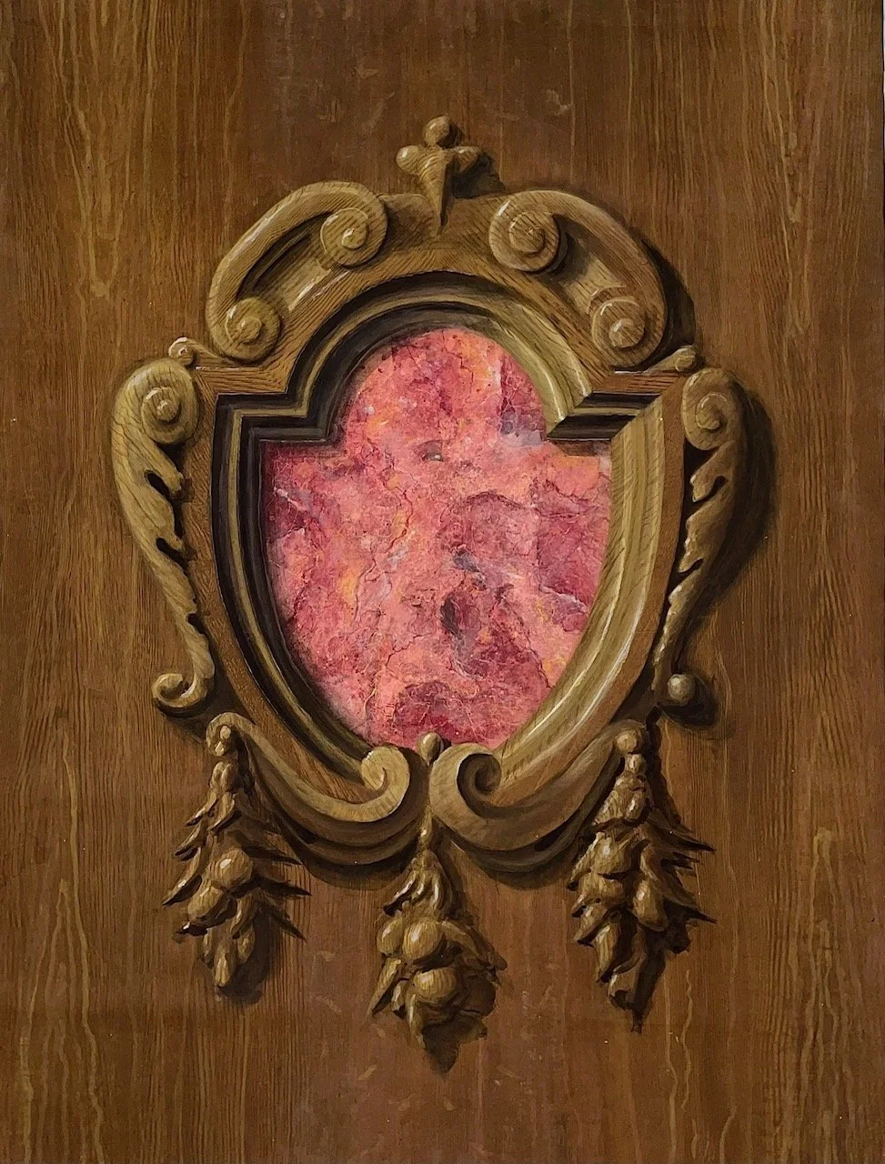EXAM PIECE: Faux oak cartouche with faux golden rose marble center.